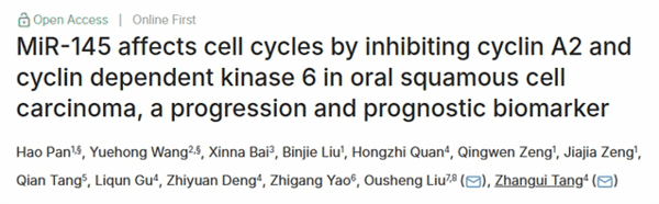 Pan H, Wang Y, Bai X, et al. MiR-145 affects cell cycles by inhibiting cyclin A2 and cyclin dependent kinase 6 in oral squamous cell carcinoma, a progression and prognostic biomarker. Oral Science and Homeostatic Medicine, 2025, https://doi.org/10.26599/OSHM.2025.96100