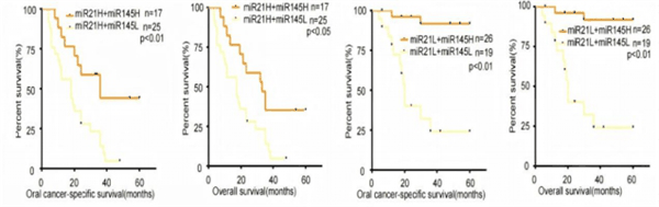 图1:双miRNA模型(miR-145与miR-21)在预测OSCC患者预后中的应用价值。结果显示,miR-145高表达且miR-21低表达的患者具有最佳预后,五年生存率最高,约为91.6%。该模型在患者风险分层和个体化治疗策略制定中具有潜在临床应用价值。