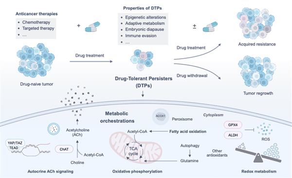 图1. 药物耐受持久性肿瘤细胞(DTP)的代谢重塑调控