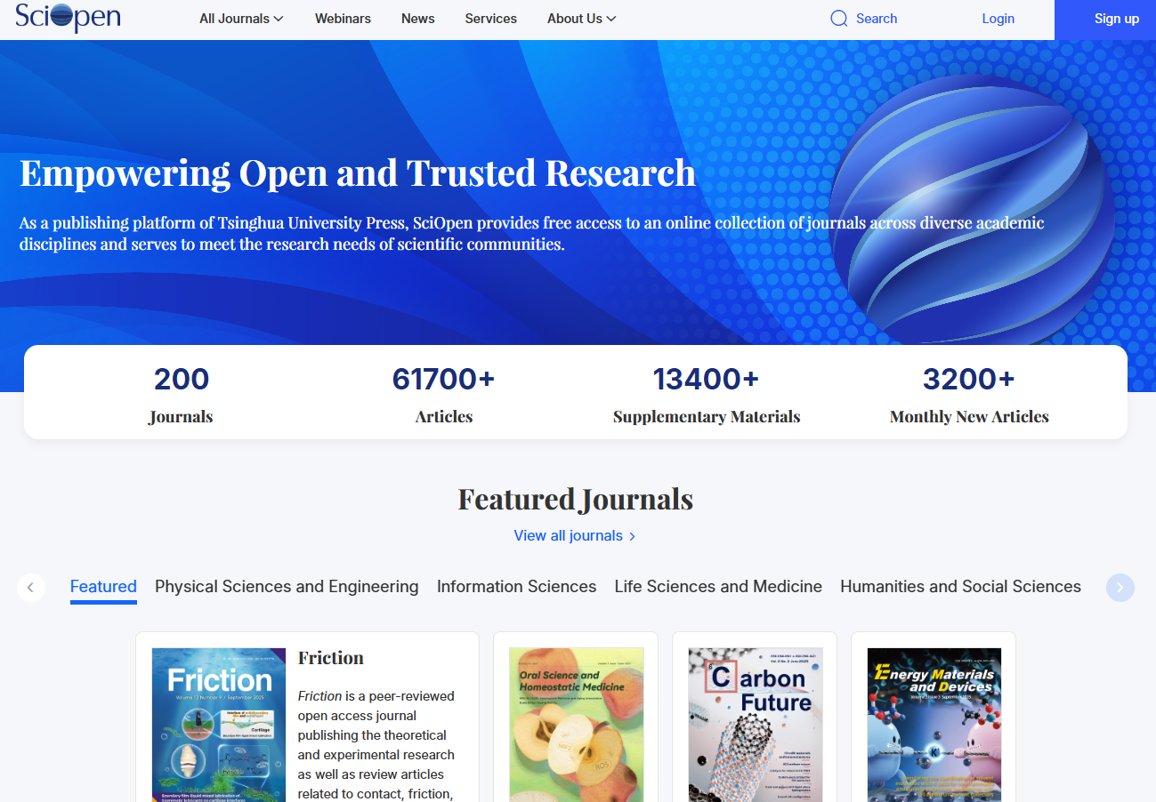 作为清华大学出版社自主开发的科技期刊国际化数字出版平台,SciOpen近日迎来关键里程碑——上线期刊数量正式突破200种。这一成果不仅彰显了平台对国产优质期刊的强大聚合能力,印证了SciOpen在助力本土期刊全球化传播上的突出成效,更吸引了包括 AIMS(American Institute of Mathematical Sciences) 、 Tech Science Press 等国际知名机构旗下期刊的主动加盟。