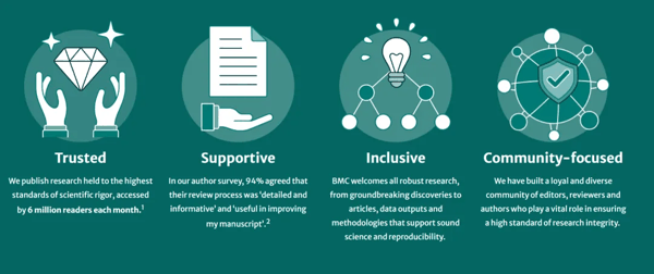 严格的同行评审 。 我们率先建立了专门的 科研诚信 团队,奠定了我们在高质量开放获取出版领域的声誉。选择 BMC,意味着你的研究将通过严格且透明的评审流程得到验证,并符合高科研诚信标准。