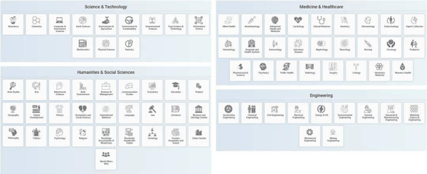 进入Taylor & Francis网站的Knowledge界面,您就可以看到以学科分类的各个板块,其中包括:Science & Technology、Medicine & Healthcare、Humanities & Social Sciences以及Engineering四大板块,每个大板块中设有若干细分领域。
