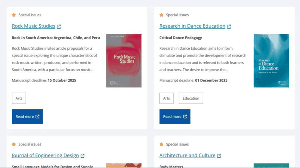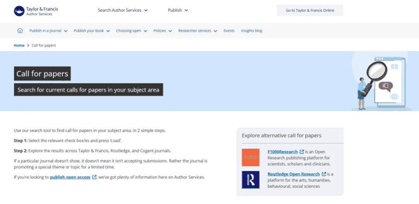 征稿信息零散、更新慢,是许多作者常见的困扰。Call for Papers工具帮您定期获取Taylor & Francis各大期刊最新征稿动态,您可根据研究方向精准搜索,第一时间掌握动态,提前做好投稿准备。