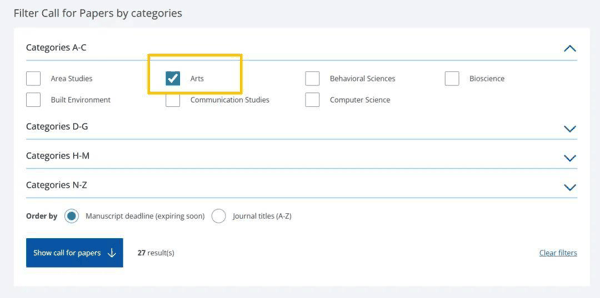 假设您是一位艺术相关领域学者,您可在学科领域选择【Arts】,如下图所示: