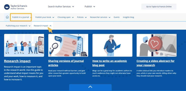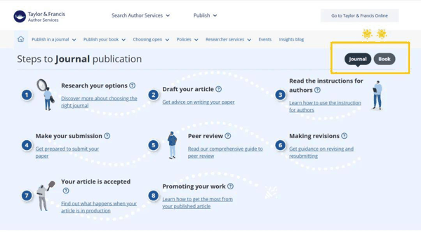 新手学者 可以通过首页 Journal/Book两个按钮 直观地了解在Taylor & Francis发表文章或是出版图书的步骤。点击标题下方的超链接,学者可以进一步探索该出版步骤中的更多攻略与指导。