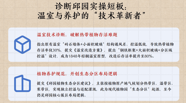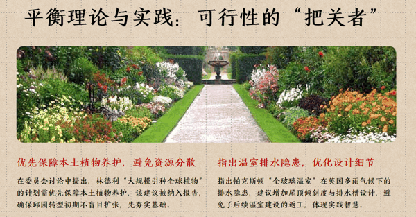 ( 2 ) 平衡理论与实践:可行性的 “ 把关者 ” 威尔逊的核心价值在于 “ 让报告理念不脱离实际 ” :他在委员会讨论中提出,林德利 “ 大规模引种全球植物 ” 的计划需 “ 优先保障本土植物养护 , 避免资源分散 ” ,这一建议被纳入报告,确保邱园 转型初期 “ 不盲目扩张 , 先夯实基础 ” ;同时指出帕克斯顿 “ 全玻璃温室 ” 在英国多雨气候下的 “ 排水隐患 ” ,建议增加 “ 屋顶倾斜度 与 排水槽设计 ”—— 这一细节修改避免了后续温室建设的返工,体现其 “ 细节决定成败 ” 的实践智慧。
