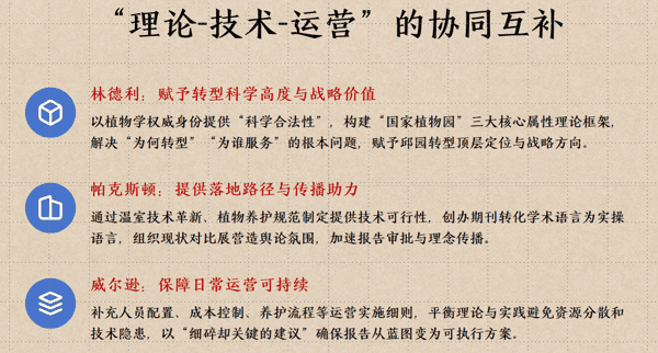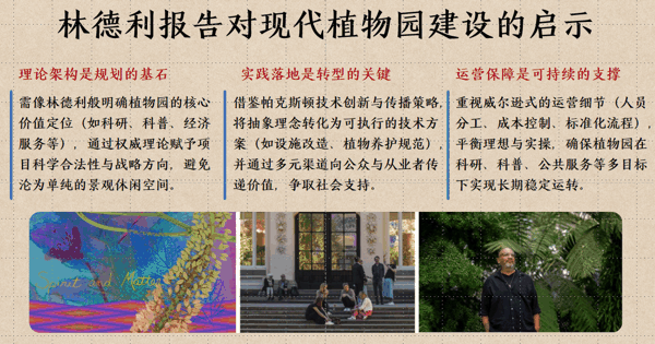 结语: 专家协同促进国家植物园转 型成功的核心逻辑 林德利报告推动邱园转型的本质,是三位专家 “ 理论 - 技术 - 运营 ” 的协同共振:林德利以植物学权威赋予转型 “ 科学高度与战略价值 ” ,帕克斯顿以技术创新提供 “ 落地路径与传播助力 ” ,威尔逊以实践经验保障 “ 日常运营可持续 ” 。三者虽背景不同(理论学者、技术设计师、实践园艺师),却共同指向 “ 让邱园服务于国家、科学与公众 ” 的核心目标。