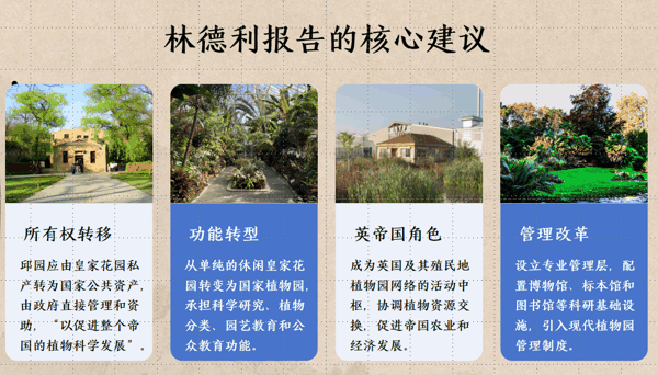 ( 2 ) 构建报告核心框架:定义 “ 国家植物园 ” 的内涵 报告中 80% 的理论内容由林德利独立撰写,他首次清晰界定 “ 国家植物园 ” 的三大核心属性,彻底区别于传统皇家花园: