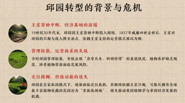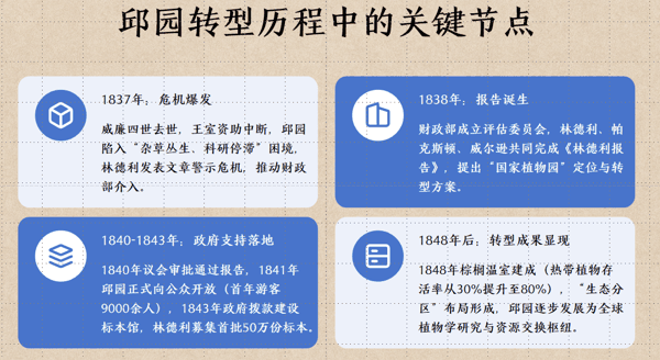 ( 1 ) 发起报告:洞察危机的 “ 先行者 ” 林德利是最早意识到邱园 “ 皇家私园模式不可持续 ” 的学者: 1837 年,他在《伦敦植物学杂志》发表《邱园的科学价值与危机》一文,指出 “ 若继续依赖王室兴趣,这座拥有全球最丰富植物收藏的花园将沦为 ‘ 贵族休闲地 ’ ,错失推动英国植物学与帝国经济的机遇 ” 。正是这一论述直接推动财政部成立评估委员会,他也凭借 “ 植物分类学权威 ” (伦敦大学学院首位植物学教授、皇家学会会员)的身份被推举为主席,主导调研方向。
