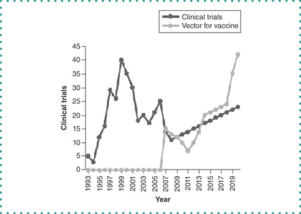 Figure 1. Trends in the rise and fall of AdV vectors in clinical trials of gene therapy and vaccine delivery for various diseases from 1993 to 2019.