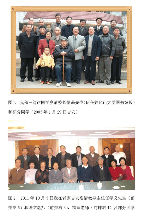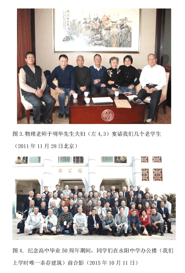 显然,我从来没有因为永阳中学的“停膳公告”记恨过永阳中学。这个停膳通知学生名单“事件”也丝毫没有影响我的学业以及我和学校领导及老师之间的感情和友谊。日记显示,1997年暑假永阳中学建校40周年,已经成长为大学教授的我托人给学校带去一件纪念品,了却我的感恩与思念母校之情。此后,数十年来,我与学校领导和多位老师保持良好的师生友情。例如2003年1月29日 我和王笃达同学(高中同班同学,华东师范大学毕业后长期在湖南省委工作)利用回老家机会宴请校长傅晶先生和部分同学(图1)。2011年国庆节期间我刚办理退休手续,利用回老家省亲机会宴请教导主任任学义先生、语文老师刘光俊先生和物理老师于明华先生(图2)。2011年11月中我去北京出差,物理老师于明华先生夫妇(他们退休后随儿子定居北京)还专程宴请我们几个老学生(图3)《于老师北京宴请老学生,2012年1月24日科学网》。2015年我们在老家聚会,隆重纪念高中毕业50周年,我们这些老学生还特地前往永阳中学参观游览,并赠送纪念品(图4)。2025年我们还在老家举行了高中毕业60周年纪念活动,23位已经或即将迈入“八零后”的同学出席(图5)。这些活动彰显了我与母校永阳中学之间割舍不断的情结。