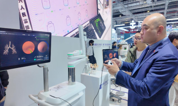 第93届CMEF现场,微创展示其支气管肺癌早诊机器人。新华网逦琛 摄