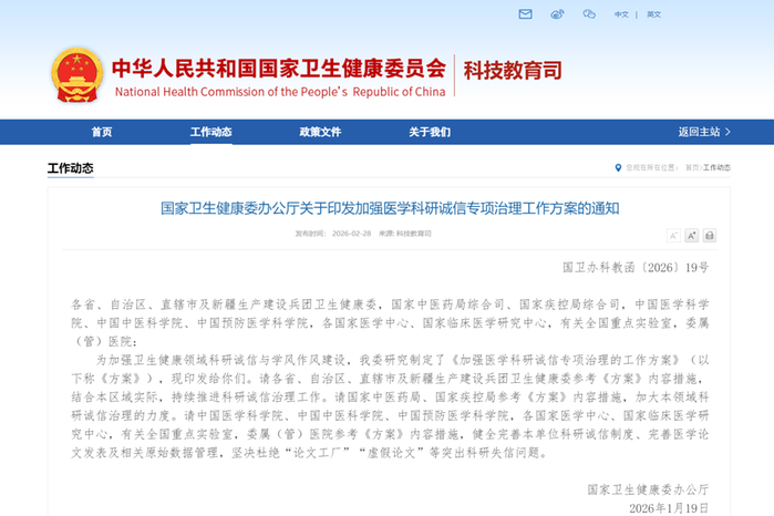为加强卫生健康领域科研诚信与学风作风建设,我委研究制定了《加强医学科研诚信专项治理的工作方案》(以下称《方案》),现印发给你们。请各省、自治区、直辖市及新疆生产建设兵团卫生健康委参考《方案》内容措施,结合本区域实际,持续推进科研诚信治理工作。请国家中医药局、国家疾控局参考《方案》内容措施,加大本领域科研诚信治理的力度。请中国医学科学院、中国中医科学院、中国预防医学科学院,各国家医学中心、国家临床医学研究中心,有关全国重点实验室,委属(管)医院参考《方案》内容措施,健全完善本单位科研诚信制度、完善医学论文发表及相关原始数据管理,坚决杜绝“论文工厂”“虚假论文”等突出科研失信问题。