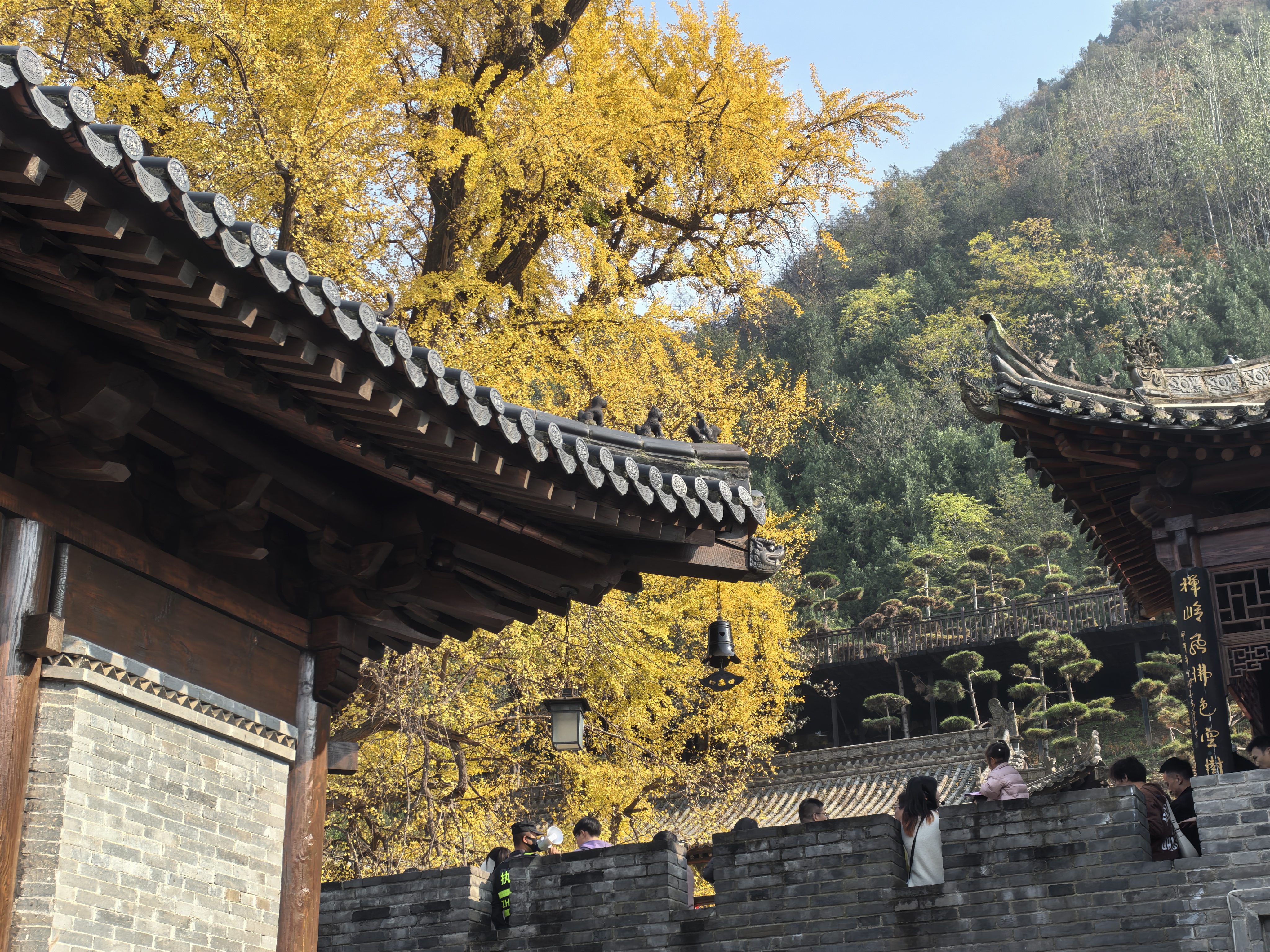 中院的回廊上挤满了赏景的访客,却出奇地安静,大家都在小心翼翼地守护着这份美好。栏干上挂着不少红色的许愿牌,有的写着“愿家人平安健康”,有的写着“愿学业顺利”,还有的是情侣共同写下的“愿携手一生”。许愿牌随风轻轻摆动,与金黄的银杏叶相互映衬,既带着对未来的期许,又满是人间的烟火气。许多人举着相机手机,踮着脚尖寻找最佳角度,想要把古银杏的全貌装进镜头;有人带着家人,把孩子扛在肩上,拍下一张满是秋意的合影;还有几位穿着汉服的姑娘,提着裙摆缓缓走过,红色、蓝色的汉服与金黄的银杏叶相映成趣,仿佛是从盛唐画卷里走出来的人物。我从回廊出来,找了一处角落的石凳坐下,手里剥着刚买的糖炒栗子,看着眼前的古银杏,听着风吹树叶的“沙沙”声和远处的钟声,忽然明白为什么这么多人执着于来这里赏秋——不是因为它有多热闹,而是因为这株千年古树,能让人在喧嚣里找到一份久违的宁静。
