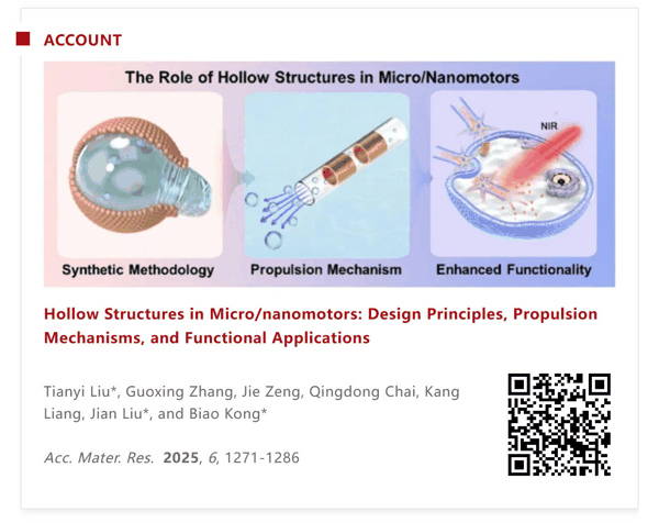 本期正封面文章来自 复旦大学 孔彪 研究员,内蒙古大学 刘健 教授与哈尔滨工程大学 刘天亿 教授团队,概述了中空微纳马达的最新研究发展,重点介绍了合成方法、推进机制和新兴应用,探讨了这一领域面临的挑战和机遇。