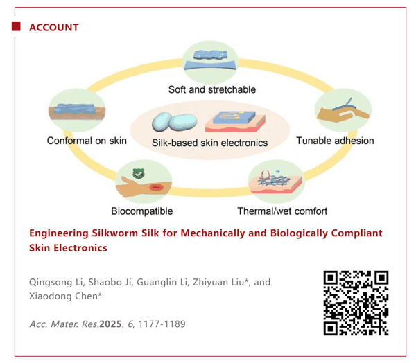 新加坡南洋理工大学 陈晓东 教授-中国科学院深圳先进技术研究院 刘志远 研究员合作团队阐述了兼顾机械顺应性与生物相容性的蚕丝基皮肤电子材料的最新研究进展,介绍了天然蚕丝纤维的层级结构与固有特性,讨论了蚕丝基皮肤电子器件的设计与功能,阐明了当前蚕丝基皮肤电子器件的局限性,并简要展望了将蚕丝开发为高性能舒适穿戴系统电子材料所面临的未来挑战与前景。