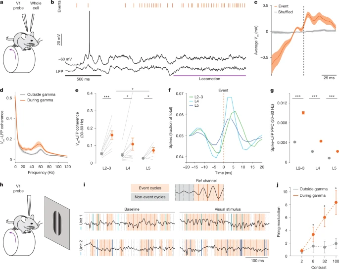 尽管伽马活动与认知过程的整体关联已得到充分证实,但伽马事件在皮层感觉加工中的具体作用仍不明确。视觉刺激会显著增强伽马事件周期内的放电 -LFP同步性(扩展数据图5f、l、o)。在自发活动期间,伽马事件的发生与规则放电单元的放电无相关性;但在高对比度漂移光栅刺激呈现期间,二者则出现相关性(扩展数据图6a-f),这表明视觉诱发的放电更倾向于在伽马事件期间发生。因此,我们对伽马事件周期内与周期外的视觉反应进行了分析(图3h、i)。结果发现:在伽马事件周期外,视觉刺激对规则放电单元的放电几乎无调制作用(图3j及扩展数据图6i);而在伽马事件周期内,无论处于何种行为状态,视觉诱发的放电均显著增强(图3j及扩展数据图6i、k、m)。部分视觉诱发活动也会在β波事件期间发生,但选择性较低(扩展数据图6g、h)。由此可见,伽马事件可对皮层神经元的视觉诱发放电进行整合。