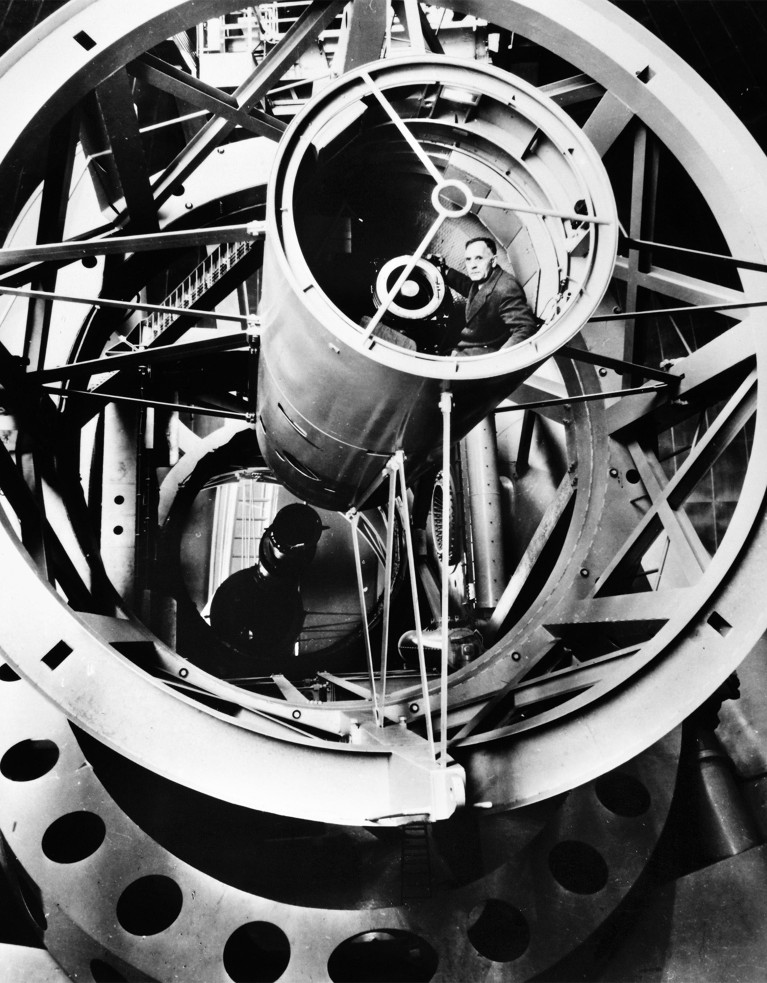 (图注: 20世纪30年代,天文学家埃德温·哈勃坐在望远镜的主焦点笼中。图片来源:格兰杰/历史图片档案/阿拉米图片库)