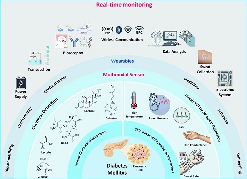 糖尿病是一个重大的全球健康问题,推动了对传统血糖监测方法的无创替代方案的需求。可穿戴技术的最新进展引入了能够分析汗液和皮肤生物标志物的皮肤接口生物传感器,为糖尿病诊断和监测提供了创新的解决方案。 英国曼彻斯特大学Yi Li等人 全面讨论了无创可穿戴生物传感器的当前发展,强调同时检测生化生物标志物(如葡萄糖、皮质醇、乳酸、支链氨基酸和细胞因子)和生理信号(包括心率、血压和出汗率),以实现准确、个性化的糖尿病管理。作者探索多模态传感器设计、材料科学、生物识别元件和集成技术方面的创新,强调高级数据分析、人工智能驱动的预测算法和闭环治疗系统的重要性。此外,本综述还解决了生物标志物验证、传感器稳定性、用户合规性、数据隐私和监管考虑方面的持续挑战。基于此,下一代可穿戴生物传感器实现的整体、多模式方法在改善患者预后和促进糖尿病管理中的主动医疗保健干预方面具有巨大潜力。