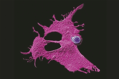 显微镜图像显示CAR-NKT细胞(蓝色)正在攻击人类实体瘤细胞(品红色)。 图片来源:美国加州大学洛杉矶分校