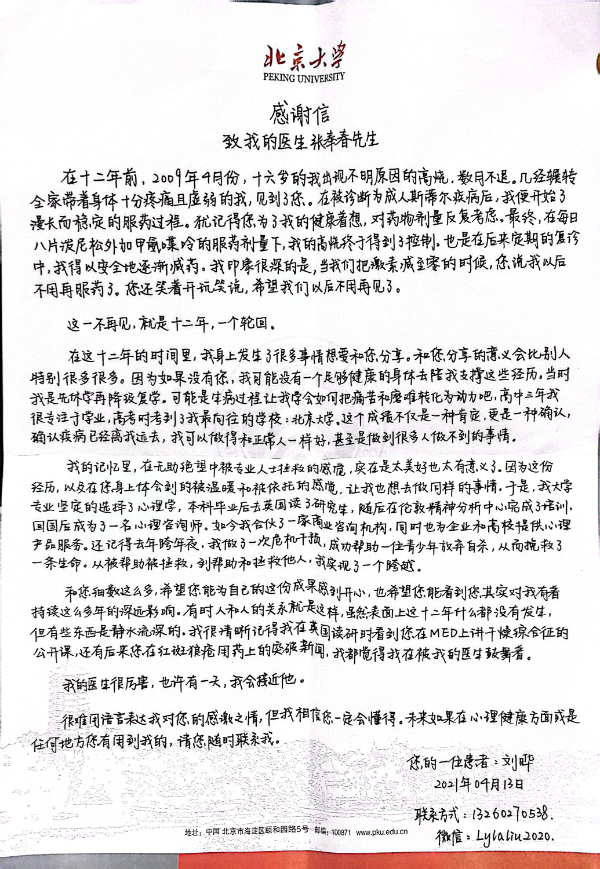 历经12年轮回,曾经四处辗转求医的患者如今已经顺利从北京大学毕业,并成为一名心理咨询师。那个曾经被张奉春从死亡线上拉回来的患者,如今成为了挽救少年生命的“天使”
