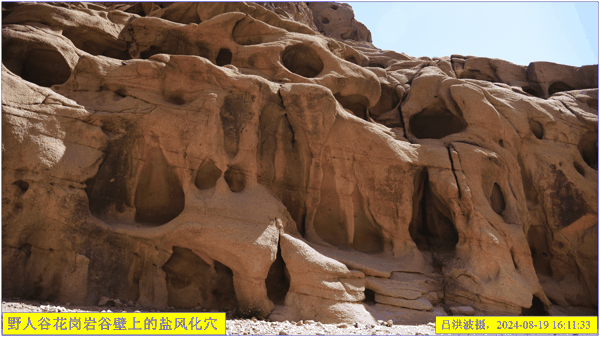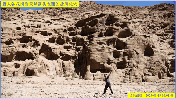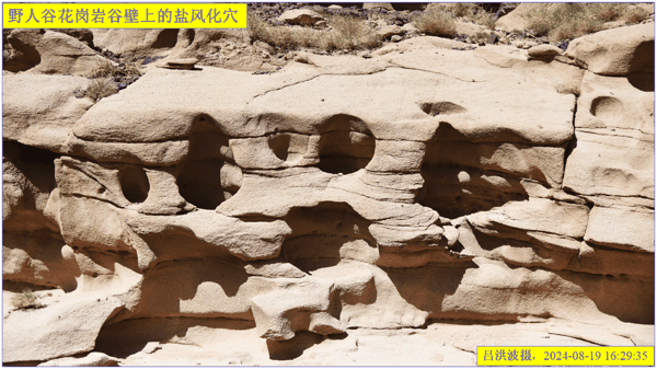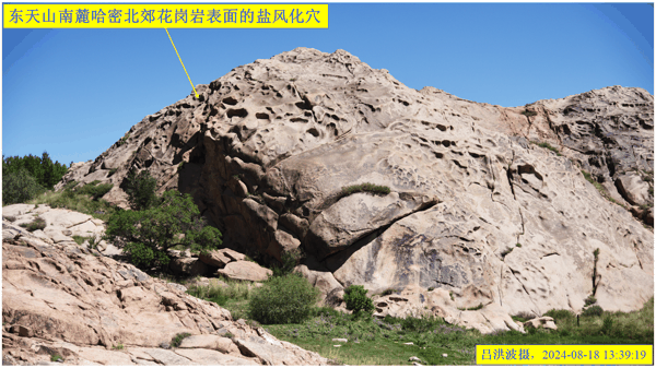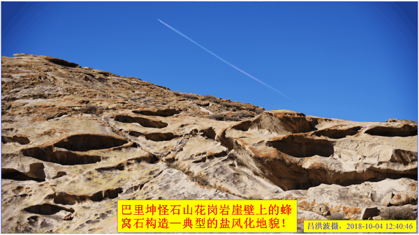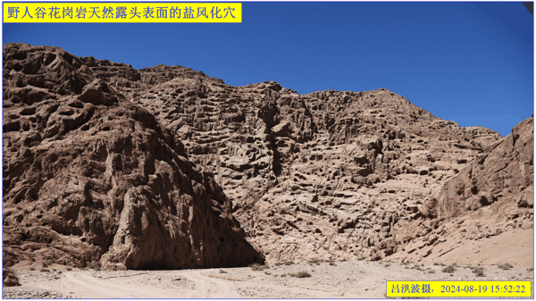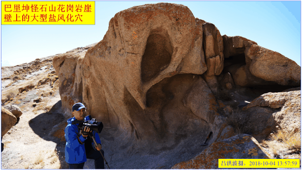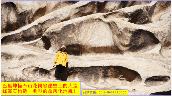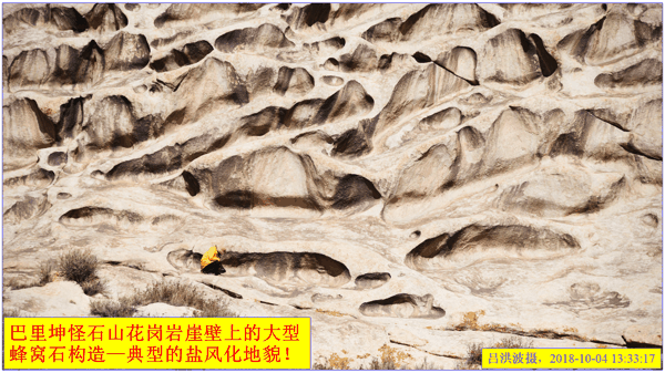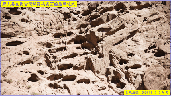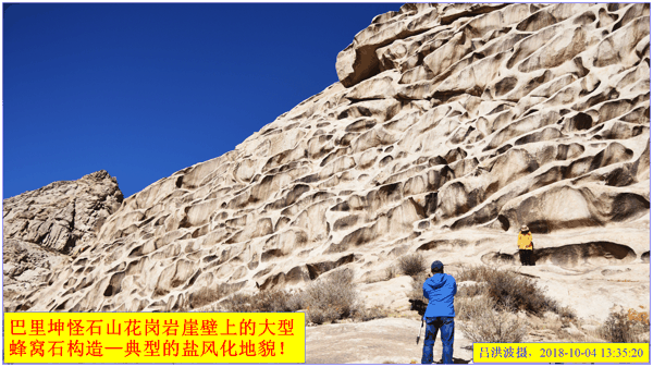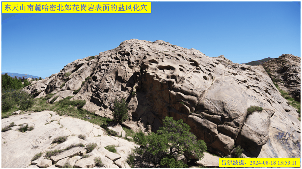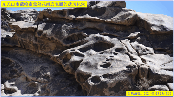 这里再次强调:巴里坤怪石山花岗岩表面的风化穴不是风蚀的,而是盐风化作用的结果。看看我拍摄的照片:
