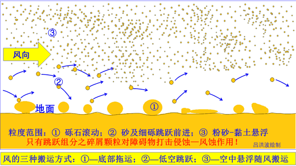 需要说明的是:风蚀作用主要是风携带着细小的砾石和砂子通过跳跃方式打击岩石表面致使其出现风蚀痕迹,高空的浮沉和地表滚动的石子是无法侵蚀岩石的。下面看风携带的碎屑特征示意图: