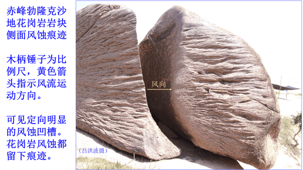 风蚀必然在岩石表面留下定向的打磨痕迹,如:内蒙古赤峰的花岗岩风蚀地貌: