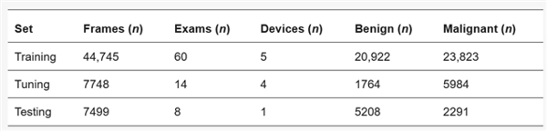 表1详细列出了图像帧、检查、设备以及良性和恶性图像帧数量的分布情况。数据集被划分为三个子集:训练集包含60次检查的44,745帧调优集含14次检查的7748帧测试集为8次检查的7499帧。表2详细列出了各中心的检查次数。