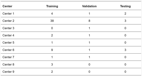 表2. 训练集、验证集与测试集中的各中心病例分布