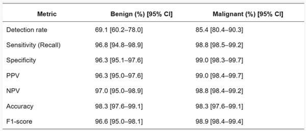 表3. AI模型在良恶性淋巴结检测与分类中的性能指标。