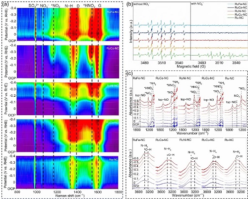 3. HER抑制机制 :原位光谱分析证明RuM-NC有效促进氮中间体的氢化,同时抑制氢自由基的形成,从而减少HER竞争。