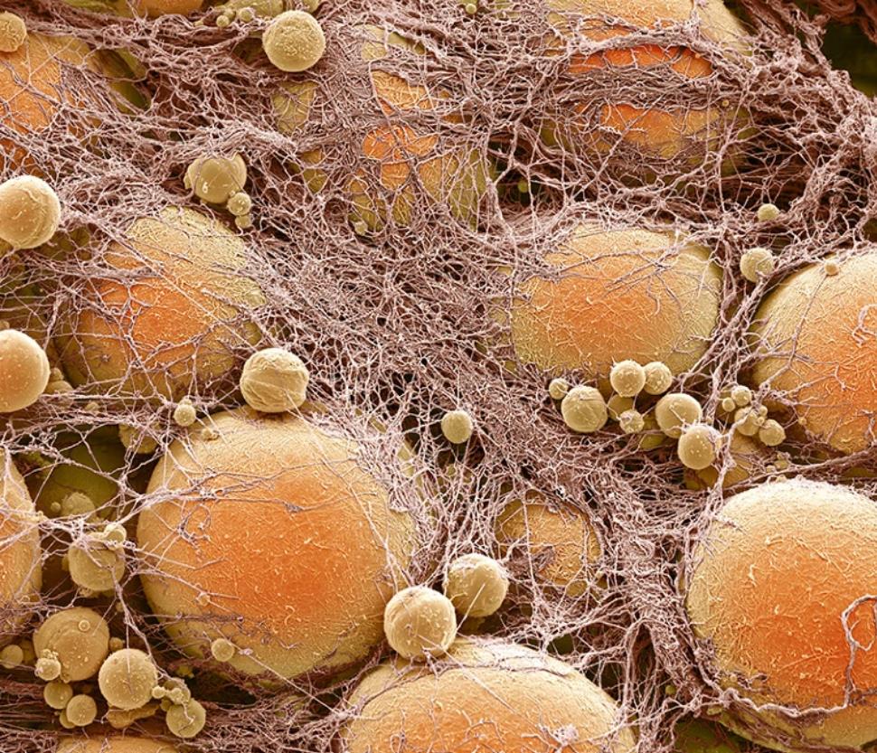 脂肪细胞(橙色)在肥胖的发展过程中会变大。图片来源:Steve Gschmeissner/Science Photo Library