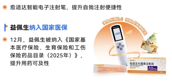 在代谢性疾病领域,特宝生物自主研发的国家1类新药长效生长激素“益佩生”于2025年获批上市,并于当年纳入《国家基本医疗保险、生育保险和工伤保险药品目录(2025年)》,自2026年1月1日起全国执行。公司披露,益佩生2期、3期均与国际原研一线产品进行头对头研究,核心疗效指标相当。同时在安全性和依从性上形成差异化:采用稳定的Y型PEG长效修饰技术,代谢产物明确,起始给药剂量较低;作为采用酵母细胞表达的长效生长激素,免疫原性低,抗体检出率为0;且不含防腐剂,搭配“次抛+隐针”一体式设计的智能注射笔,有助于降低治疗的安全性风险,大幅提升用药依从性。