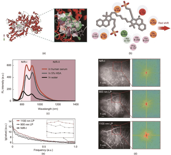 图1 (a)模拟ICG分子结合白蛋白的结构形态;(b)处于最低能量状态时,白蛋白与ICG分子之间的结合区域及涉及的作用力,不同颜色的虚线反映了不同的相互作用类型(绿色为常规氢键,淡绿色为碳氢键,粉色为π-烷基相互作用,橙色为π-阳离子与π-阴离子相互作用,红色为不利碰撞或阳离子-阳离子不利互相作用,数字表示白蛋白中氨基酸的位置);(c)ICG在水、5%人血清白蛋白(HSA)以及人血清中的发射光谱;(d)兔腹壁血管NIR-I和NIR-II荧光图像(900 nm长通窗口和1100 nm长通窗口),以及对感兴趣区域(用红框标记)FFT处理后的频谱图;(e)从(d)中的三张频谱图像获得的空间频率分布。a.u.:任意单位。