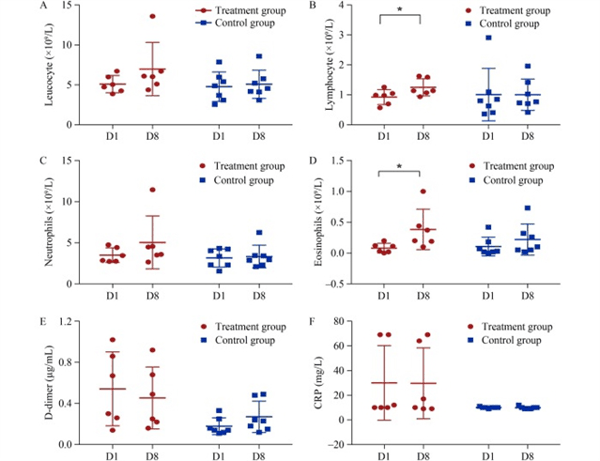 图3 治疗组与对照组患者第1天(D1)和第8天(D8)的实验室指标动态变化