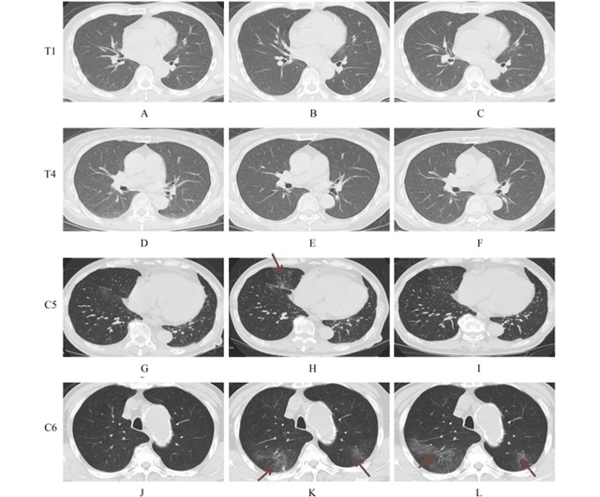 图4 治疗组(T1,A–C;T4,D–F)与对照组(C5,G–I;C6,J–L)患者的胸部CT图像