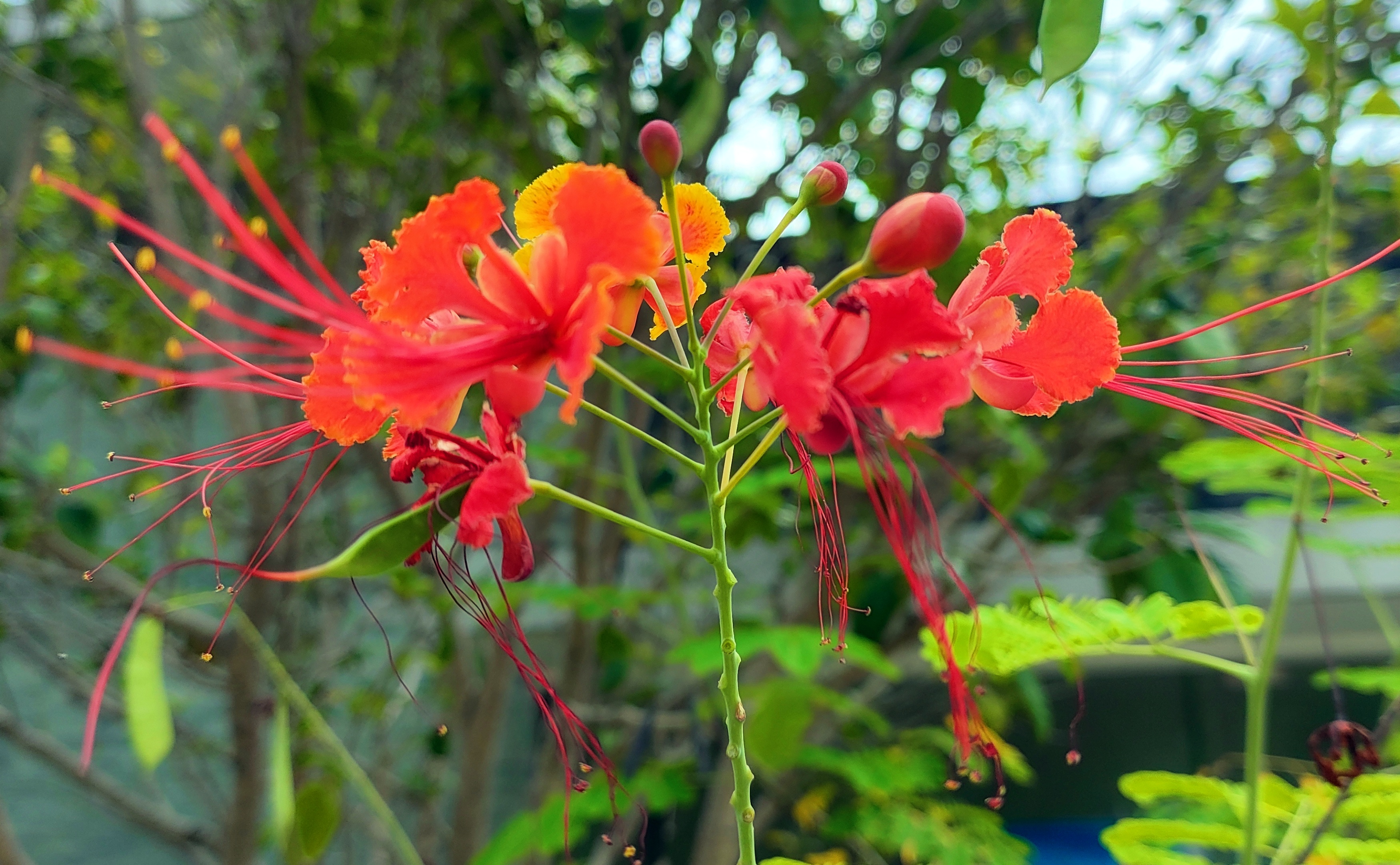 ● 花丝: 这是 洋 金凤花最迷人的部分!它的雄蕊花丝又长又红,可以伸出花瓣外 5-6 厘米,像一团燃烧的火焰,又像凤凰尾羽,或者蝴蝶的触须。正是这些长长的红色花丝,赋予了它“金凤”、“蝴蝶”的美名。