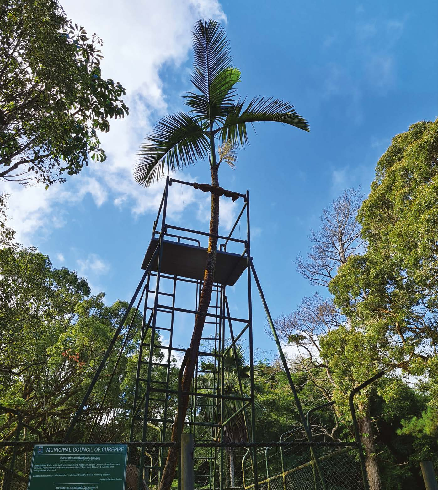 ( 2 ) 梯子 :在毛里求斯,科研人员用 9 米铝合金梯搭在 “ 孤独棕榈 ” 旁,用毛刷给雌雄异熟的穗状花序人工授粉;网袋接住仅重 0.3 g 的花粉, 4 ℃ 冷藏等待雌花出现。