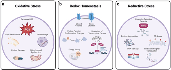 ROS通过以下机制维持细胞稳态: (1)蛋白功能重塑 ,靶向关键巯基的可逆氧化修饰精准调控酶构象与活性; (2)信号转导 ,基于酪氨酸磷酸酶/激酶系统的半胱氨酸氧化还原开关,调控MAPK、PI3K/Akt等信号通路级联放大; (3)应激防御体系 ,NRF2介导的多级抗氧化酶(如SOD、CAT)表达以抵抗损伤。 氧化还原稳态失衡将触发双向病理效应:氧化应激 (ROS超载驱动肿瘤转移、阿尔茨海默病Aβ沉积)与 还原应激 (Keap1/NRF2失调导致蛋白聚集、线粒体功能障碍),凸显了氧化还原稳态的精密调控特性。