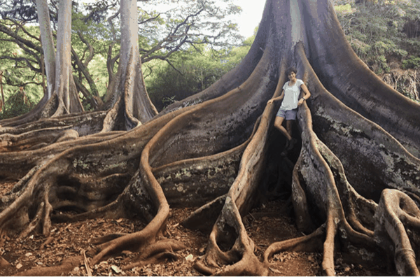 佐伊在夏威夷考艾岛 国家热带植物园莫顿湾无花果树景观